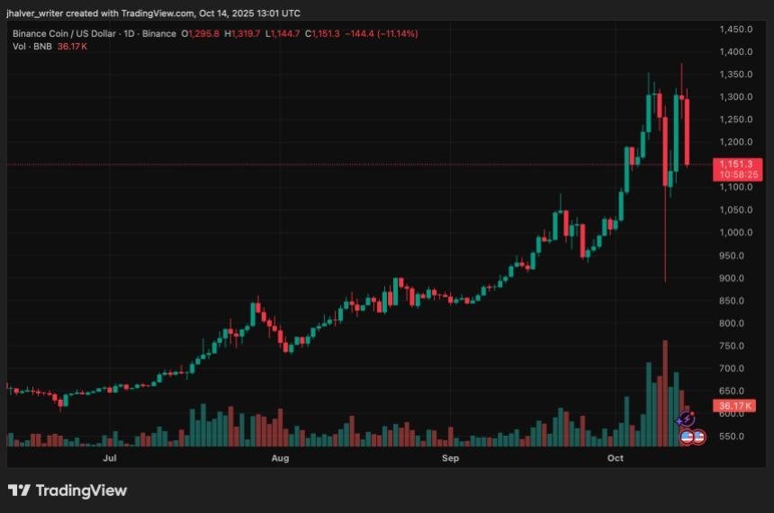 After a blistering run to fresh all-time highs, Binance Coin (BNB) has seen a significant drop. Following a push to roughly $1,370–$1,376, BNB slid about 10% in the past 24 hours, making it one of the biggest decliners on the day as traders reassess risk and profits come off the table.