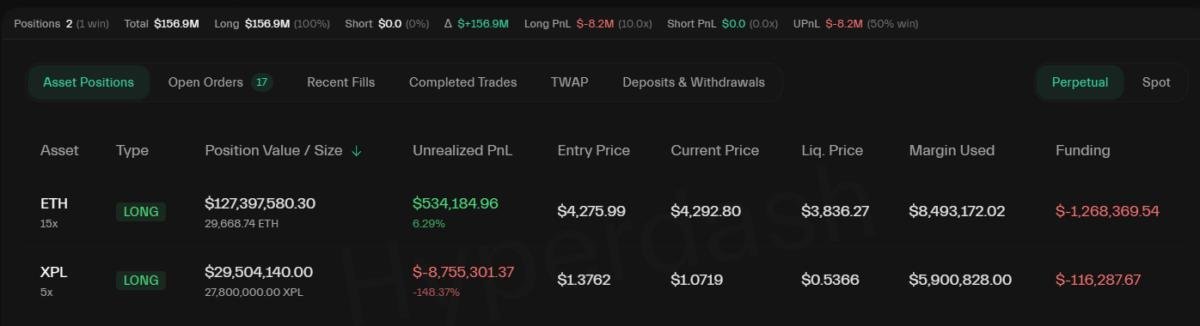 From a profit of approximately $44 million just 13 days ago, the celebrity is now sitting on an unrealized loss of $8.7 million on their 5x leveraged long position, which involves betting on the price appreciation of the Plasma (XPL) token, according to blockchain data from Hyperdash. The position has a liquidation threshold of $0.5366.